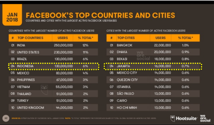 驚いたことに、インドネシアのFacebook利用者数は全世界で第4位であり、インドネシア国内で最も利用されているソーシャルメディアプラットフォームでもあります。