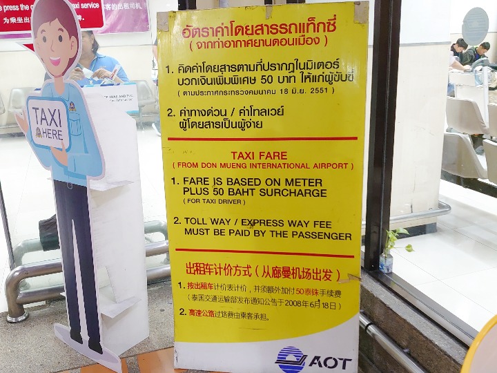 また、入り口の看板にあるように、空港で乗る場合は、メーターの料金に50バーツのドライバーチャージがかかります。
