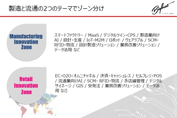 JRIT ICHIは「Manufacturing Innovation Zone」と「Retail Innovation Zone」のふたつのゾーンに分かれています。来場者の皆様には、お探しのソリューションをカテゴリー検索することができますので、すぐに目的のブースに辿り着くことができます。ブースでは、様々なe-Brochureのダウンロードができ、オンデマンドのピッチング映像が自由に視聴できます。