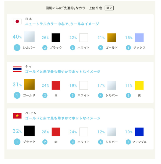 例えば、下記の調査によると「先進的なカラー」の上位は、日本は「シルバー」「ブラック」「ホワイト」に対して、タイでは、「ゴールド」「赤」「ホワイト」となっています。