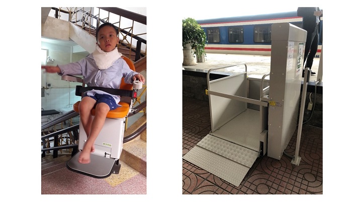 写真左:ハノイ整形リハビリ病院に設置された階段昇降機 写真右:ハノイ駅に設置された段差解消機